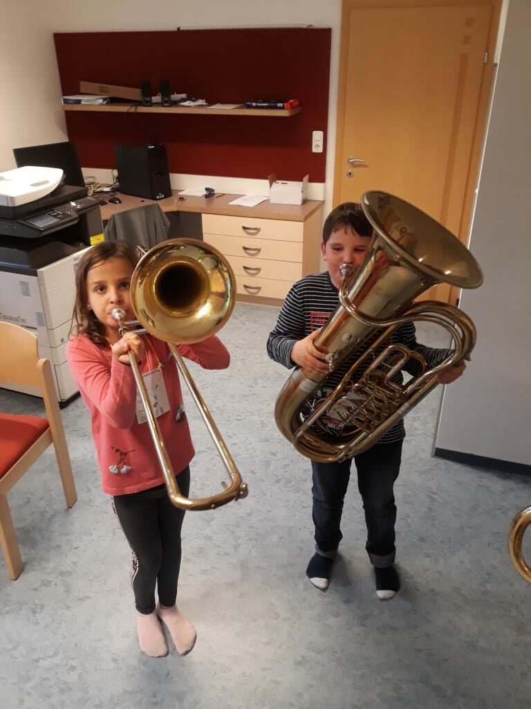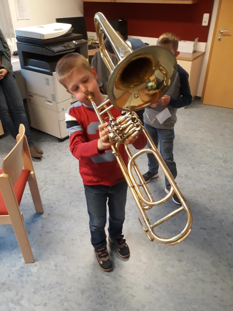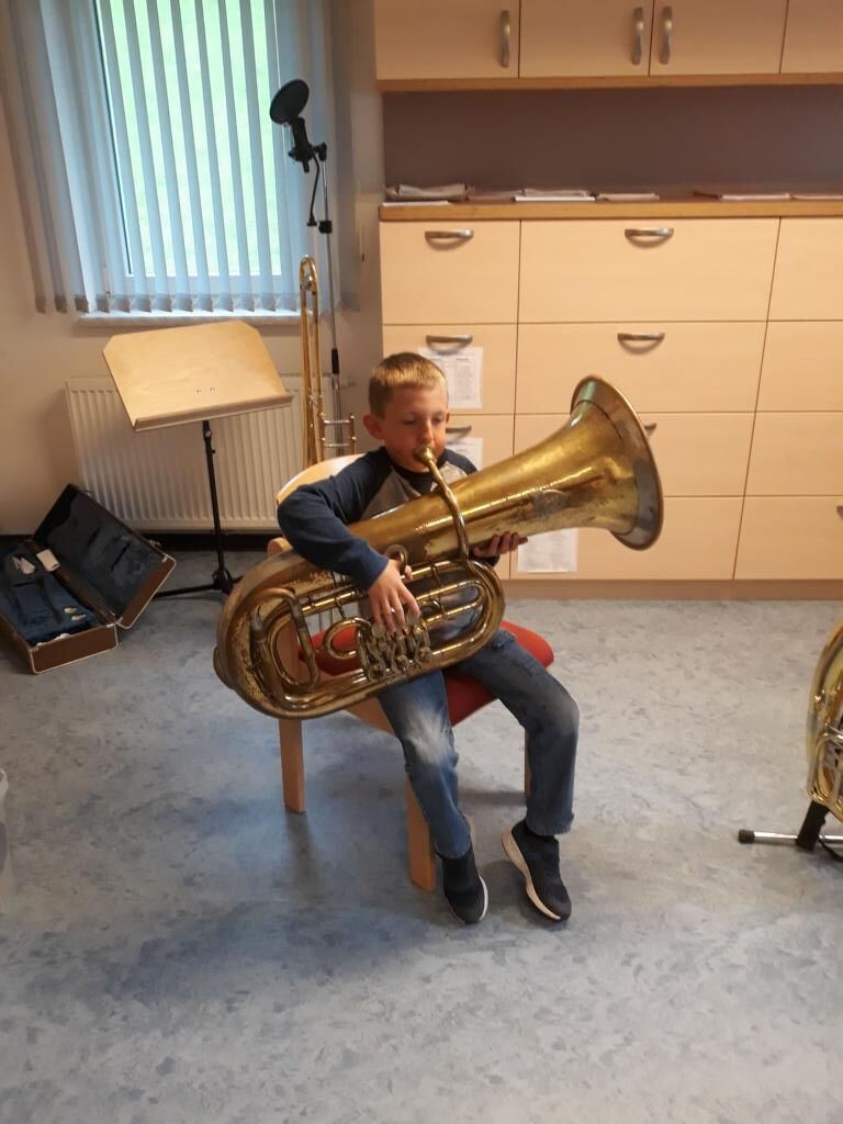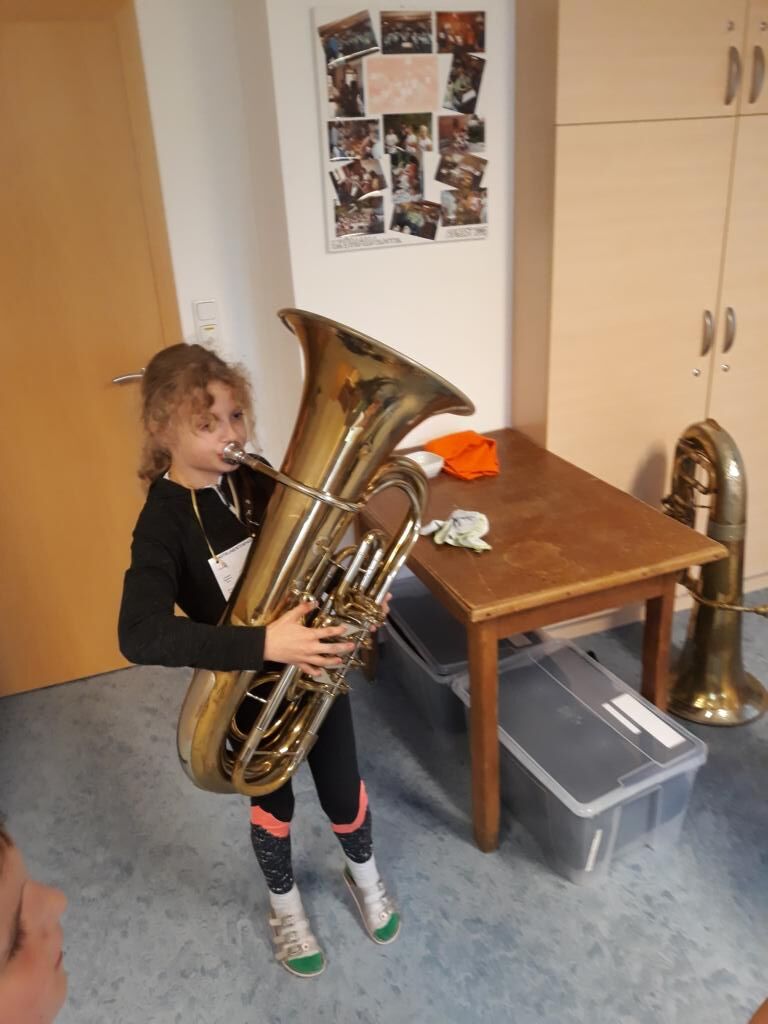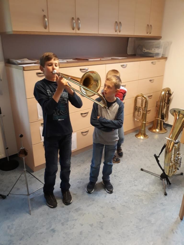 Auch heuer hatten die Kinder der Volksschule wieder die Möglichkeit am Tag der offenen (Musik-) Tür verschiedenste Instrumente einer Blasmusikkapelle auszuprobieren. Angefangen von Bass, Klarinette, Querflöte bis hin zum Schlagzeug war alles dabei und 15 motivierte Kinder nutzten diese Gelegenheit und probierten diese Instrumente aus. Sie hatten sichtlich Freude daran die Instrumente spielen zu dürfen und konnten mit Stolz erkennen, dass es gar nicht so schwer war einen Klang bzw. einen Ton mit den unterschiedlichen Instrumenten zu erzeugen.